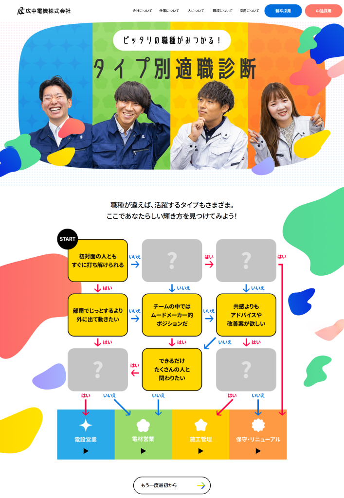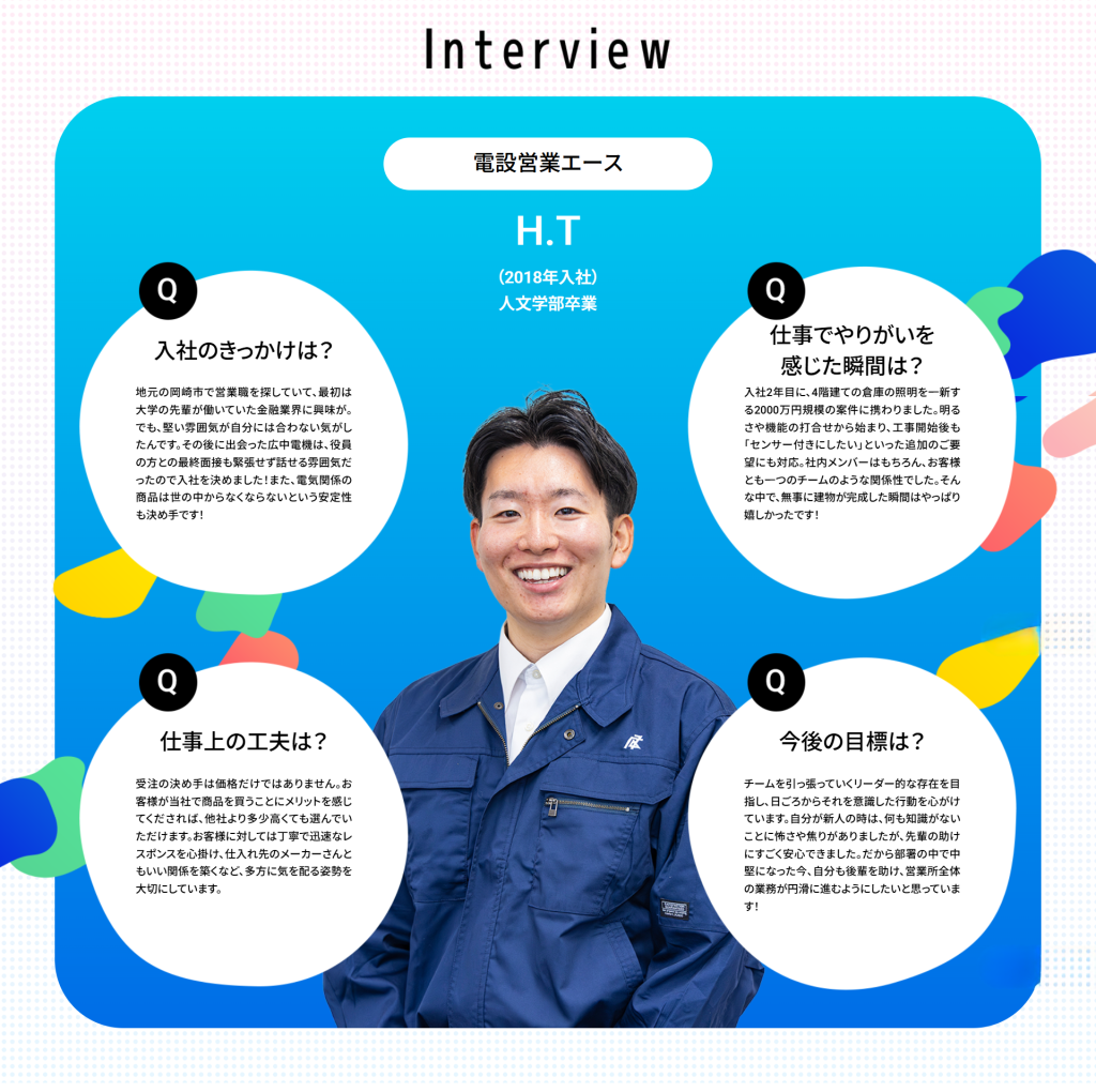 愛知県を中心に14の拠点を展開する電設資材商社様の採用サイトを制作。「商社」という枠にとらわれず、他社に先駆けた事業展開を行っている点を強みとして、さまざまなタイプの人材が活躍できるフィールドがあることを伝えました。
