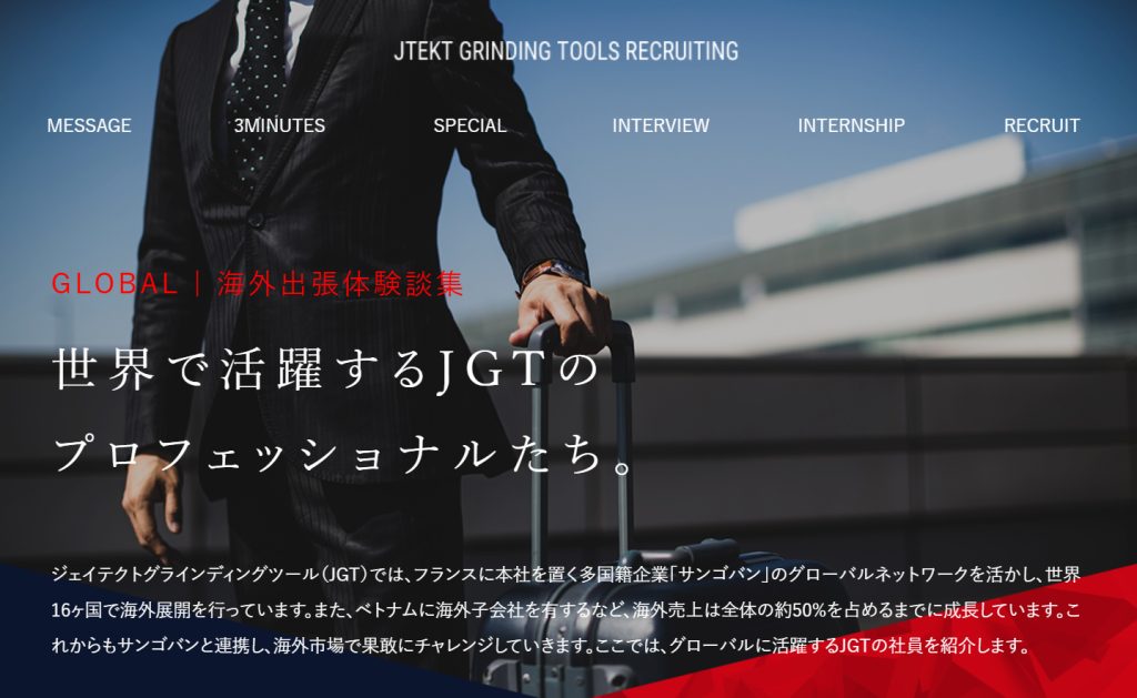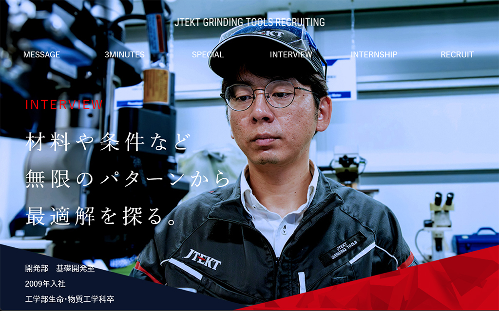 ダイヤモンド工具などの工作機械(研削盤)用工具を製造する、株式会社ジェイテクトのグループ会社。製品が求職者に伝わりにくいものであるため、ダイヤモンドが回転するような動画ビジュアルと「磨く」をキーワードにしたメッセージで印象づけるよう工夫しました。また、海外で活躍できるチャンスがあることや、働きやすい環境・制度、インターンに関する情報など、コンテンツも充実したサイトとなっています。